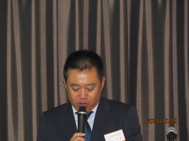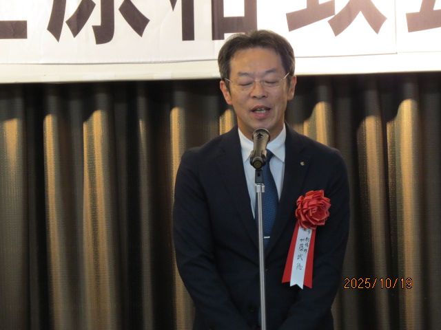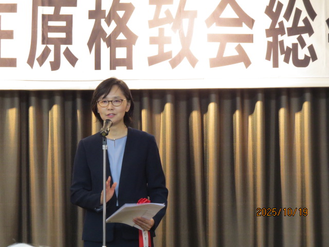 次に、庄原市長代理としてご参加の加藤武徳総務部長から市の現況として、今年、市長と市議会議員選挙があり、格致高校卒の八谷市長が誕生したこと、新たに進行している庄原市の行政について説明がありました。人口の減少が加速している現状と課題について、また、長期的な展望を持って経済や産業の向上等、取り組む内容について話がありました。