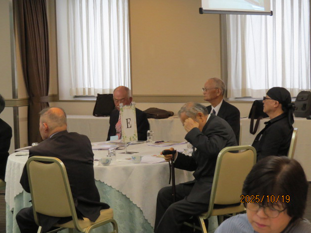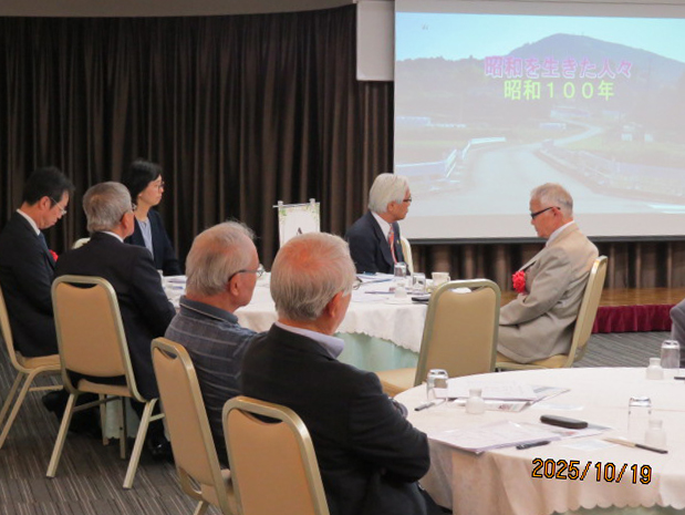 その後、武廣会長を議長に、議事に入りました。 令和6年度の事業報告、決算報告が本間事務局長より説明された後、塚原通彦監事(38年卒)より会計監査の報告があり、いずれも拍手で承認されました。 役員改選について、3名の役員が体調等の事情で退任したいとの申し出があったことを受けて、会長より提案があり、承認されました。 その他、会員名簿の削除修正についてと、事務局あてに届いたメッセージについて、報告がありました。 議事を終わり、庄原からご参加の庄原市企画振興部地域振興課、関浩樹課長から「庄原の現況」のお話と、峰田の自治振興区が作成された大変懐かしいDVDの上映がありました。 その後、集合写真の撮影(当日プリントして配布)、懇親会へと移りました。