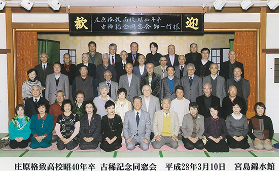 平成28年3月10日に格致高校40年卒の古稀同窓会を行いました。 初日は原爆ドーム前に12:00に各地から集合し平和記念塔で祈念して、フェリーを貸し切り中で食事、談話をしながら宮島桟橋に着き、ロープウェイで二つの山を渡り弥山535mを恩師の名越、大石先生も頑張って登られ頂上に着きました。その日は快晴で遠く島々が眺芽られ最高でした。 夕方、錦水館で風呂を浴び記念撮影、宴会と続き一人づつ自己紹介をして中締め。部屋に帰り一晩中、朝まで男、女の子?共に飲み明かした様です? 翌日厳島神社で参拝、一人一人名前でお祓いを受けて再会を期して別れの途に付きました。 今回は恩師を含め47人。東京格致会からは7人が参加しました。