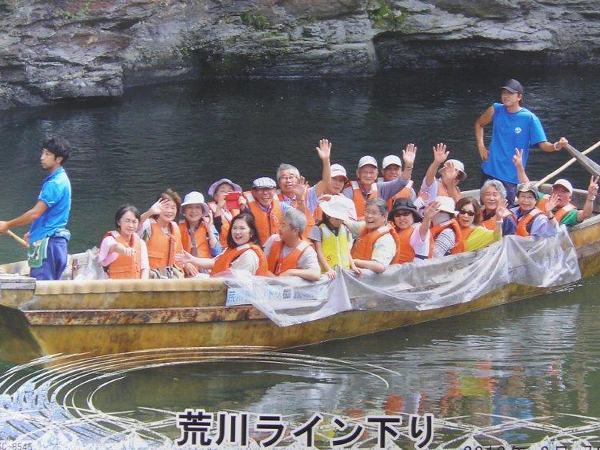 花園ICから皆野寄居高速に入り、道の駅花園で休憩、午前11時30分から 荒川ライン下り、船付き場で両会の旗を広げて記念写真を撮影しました。