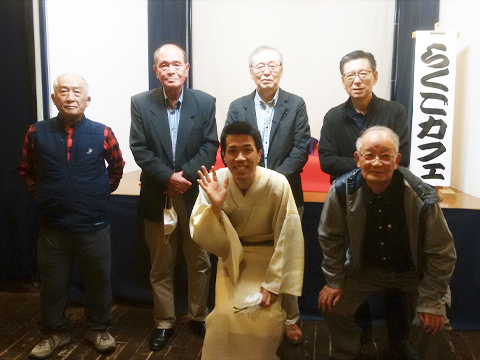 6月6日(月)の夕方、林家ひろ木後援会のメンバー5名が神田神保町2-3神田古書センター5F「らくごカフェ」に集まりました。あいにくこの日は雨降りでしたがひろ木師匠の43歳の誕生日、18時30分開場、木戸銭2,000円(前売り1800円)を払って入場、師匠が笑顔で迎えられました。 直ぐに舞台前で記念撮影をしました。 19時開演、師匠が前口上を述べた後、師匠である木久扇師匠が「階段を降りる時、右手で杖、左手で手すりを持ちゆっくり安全に降りられるが平坦の所では転ばれる(笑)・どこを骨折したのですか?だいたいここら辺(大腿部付近を指さす)(笑)」など面白く話されました。 木久扇師匠が出ておられるテレビの笑点では現在は高齢者が多く、楽屋に看護師さんが待機されているそうです。また、殆どの師匠が薬持参で来られており、「木久扇師匠の痔の薬を小遊三師匠が目薬と間違えられそうになった(笑)」など面白いお話がありました。 その後、ひろ木師匠の津軽三味線の豪快な音色を披露され拍手、拍手でした。そして最後に、創作落語を一席話され、20時30分過ぎにお開きになりました。 東京庄原格致会の参加者は、後援会長の助政千尋(40卒)・生田八洲紘(33卒)・積山弘佳(35卒)・花田和教(40卒)・武廣巌(48卒)「敬称略」の5名でした。
