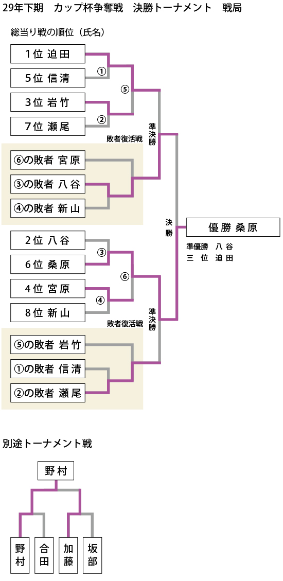 29年12月の第196回月例会は、7月から11月の対局結果の中で、成績優秀上位八人による格致カップ杯争奪戦が行われ、桑原貞之さんが見事に優勝し、賞金を獲得しました。(対局経過は下図を参照)