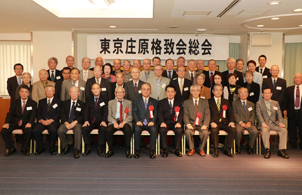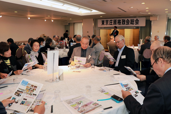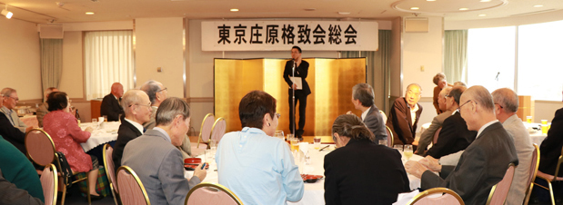 即位礼正殿の儀を二日後に控えた10月20日(日)、数日来の天候不順で心配していた天気も東京庄原格致会を応援・祝福してくれるかのように暖かく、まずまずのコンデションとなり、11時過ぎから次々と同窓生が集まってきました。遠くは湖西市(静岡県)からも参加していただきました。母校今岡校長他4名の来賓の皆様を含めて総員47人、一年ぶりの再会を楽しみました。会場には一週間前に帰郷した助政さんが撮影された庄原市内の写真(備北公園等)や林家ひろ木師匠((平成10年卒)のポスターが掲示されていました。カープ応援歌が流されていないのに淋しさも感じました。