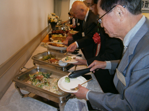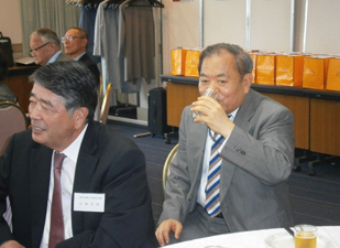 「定年後の人生をいかに歩むか、会社の名刺で生きる人間はダメ」「過去を振り返らず明日を元気に頑張ろう」等のスピーチをされた後、1.明るく 2.楽しく 3.前向きに と三分の一ずつ三回で杯を空にする方式(三つの頭文字をとって「あたま」が大切との趣旨)で乾杯の発声をされ、楽しい食事・団欒に入りました。