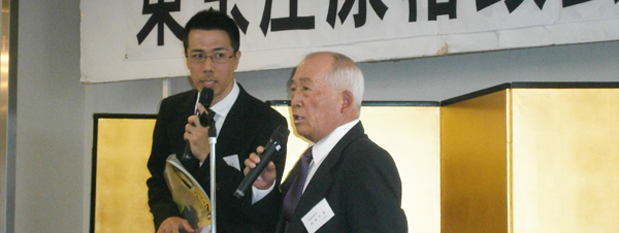| 司会の挨拶をする助政新幹事長 | 来賓挨拶・乾杯の大竹会長 |