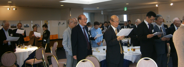 団欒の輪が盛り上がる中、庄原郷土民謡「敦盛さん」を大岩征子さんのリードで歌い、次いで元母校教員であった佐藤 勉さんのリードで校歌・応援歌を高らかに歌い上げました。