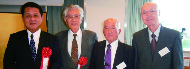 | 中田毅さん(39)・今岡校長・佐藤副会長 | 県人会の小林正治と新宅一二三さん(42) |