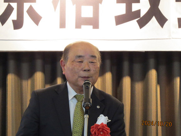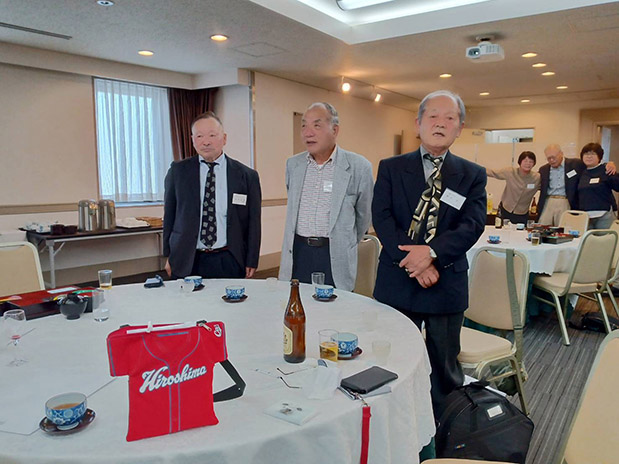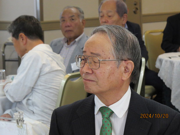 今年は年明け早々の能登半島の地震、異常な温暖化による農作物の不作など、家庭にも心配事が及んだ。ウクライナ戦争や中東半島の状況など、世界的に暗いニュースも続いている。そのような中、先般、日本被団協(日本原水爆被害者団体協議会)がノーベル平和賞を受賞するという嬉しいニュースがあった。今日のこの会にご参加の宮角孝雄さん(41年卒)も長年8月6日の広島の写真を撮り続け「ノーモアヒロシマ」を訴え続けて来られた。お祝い申し上げます。 残念だったことと言えばカープだが、9月上旬に皆さんのお手元にお届けした会報の発送作業を行なった日、今日のこの総会がカープの祝勝会になることを予期したが、その直後から敗退した9月のカープを皆さんはどう見ておられたか?また来年に期待したい。 会の運営については、会費納入数もご寄付も昨年並みで、会の状況もたんたんと過ごせている。今後も会へのご協力をお願いする。 私事だがもうじき83歳になることもあり世代交代を考えていたが、今回、会長の交代を提案したい。このあとの議事で審議をお願いする。 同窓会は同じ高校で青春時代を過ごした者たちの心のオアシス。来年も元気でこの場でお会いしましょう。