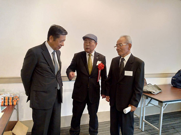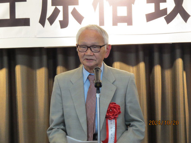 次に、本校同窓会より会長代理としてご参加の藤谷善久副会長(40年卒)から、前谷邦治幹事長(平成元年卒)とともに参加した旨、ご挨拶をいただきました。その中で本校の同窓会総会が11月2日(土)に「桜花の郷ラフォーレ庄原」で行なわれること、記念講演は県立広島大学の森永力学長をお願いしていること、また、本校創立130周年記念行事を2年後に控えて企画していること等、お話がありました。