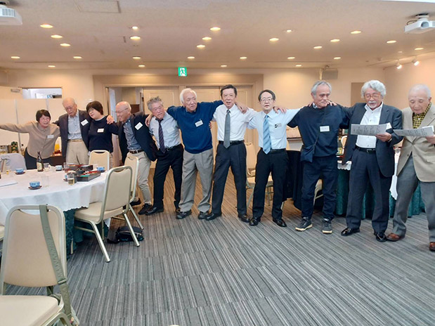 その後、集合写真を撮影し、懇親会へと時間が流れて行きました(写真は当日配布)。 懇親会は幹事長の助政千尋さん(40年卒)の司会で、生田八洲紘さん(33年卒)の乾杯の音頭に始まり、庄原実業高校同窓会東京支部支部長の新井教亨さん、世羅高校東京校友会副会長の木原吉一さんからお祝いの言葉をいただきました。また初参加の管田博文さん(47年卒)のご挨拶、ヒロシマを撮り続けた宮角さんから発行予定の写真誌の紹介、吹奏楽部からホルン奏者となって東京交響楽団で活躍された梅田学さん(39年卒)の生演奏、木曽隆治さん(46年卒)の独唱による歌「庄原季節巡り」など盛りだくさんの演出がありました。 後半には庄原市の足羽課長より昭和55年当時の市内の様子を撮影した懐かしい映像が上映され、参加者一同しみじみと見入りました。 その後、市の民俗芸能大会で上演された「敦盛さん」をDVDで見せていただきました。また、参加者最高齢の室伏孝一さん(25年卒)から健康長寿の秘訣を、副事務局長に就任された参加者最年少の坂口純代さん(53年卒)から自己紹介と抱負を、そして新旧事務局長の武廣さんと本間ますみさん(49年卒)が「それゆけカープ」を、最後に全員で肩組み円陣となって校歌を歌い、副会長の花田和教さん(40年卒)の中締めでお開きとなりました。 今年も八谷会長の弁の通り同窓生の「オアシス」となる楽しい会となりました。名残惜しくも事務局が用意したお土産を手に解散しました。来年もお元気で、ぜひ新しい会員を誘って、再会しましょう。