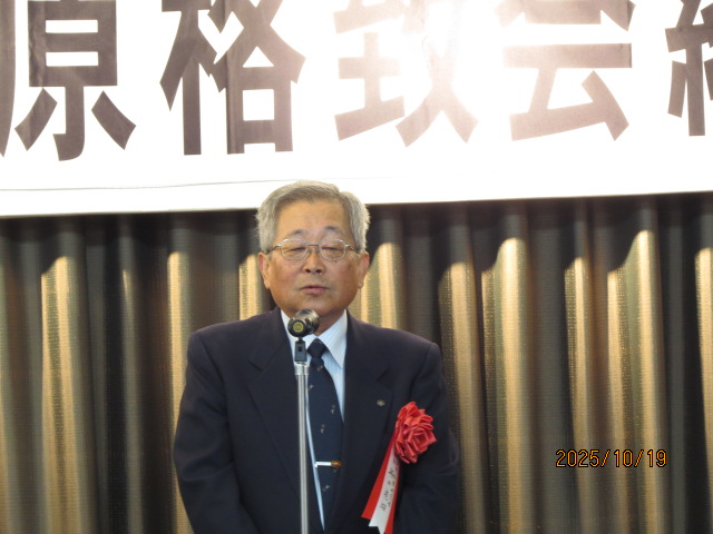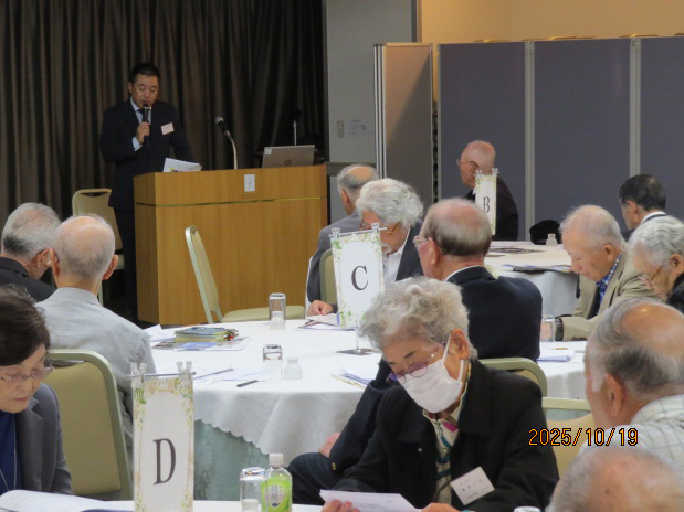 その後、武廣会長を議長に、議事に入りました。 令和6年度の事業報告、決算報告が本間事務局長より説明された後、塚原通彦監事(38年卒)より会計監査の報告があり、いずれも拍手で承認されました。 役員改選について、3名の役員が体調等の事情で退任したいとの申し出があったことを受けて、会長より提案があり、承認されました。 その他、会員名簿の削除修正についてと、事務局あてに届いたメッセージについて、報告がありました。 議事を終わり、庄原からご参加の庄原市企画振興部地域振興課、関浩樹課長から「庄原の現況」のお話と、峰田の自治振興区が作成された大変懐かしいDVDの上映がありました。 その後、集合写真の撮影(当日プリントして配布)、懇親会へと移りました。